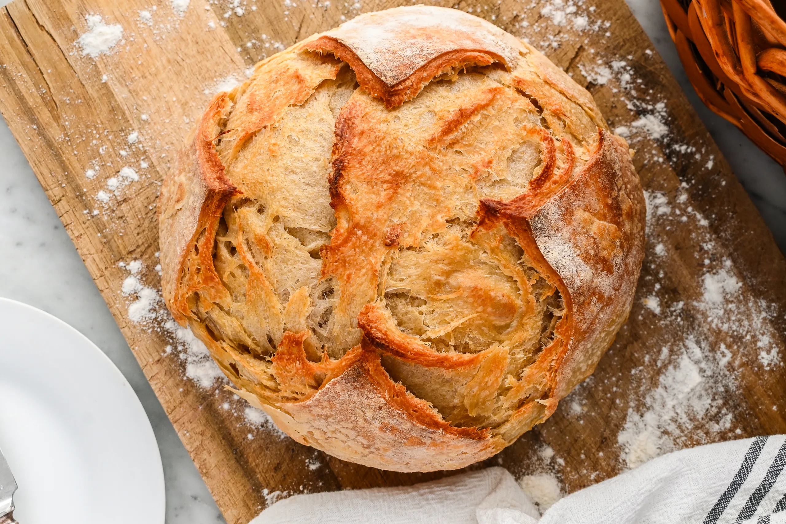 - Lightly dust off any excess flour if needed, score the top with a sharp knife or bread lame, and use the parchment to carefully lift the dough into the preheated Dutch oven. Cover and bake for 25 minutes, then uncover and bake for another 15 to 20 minutes, until the crust is deeply golden and crisp.