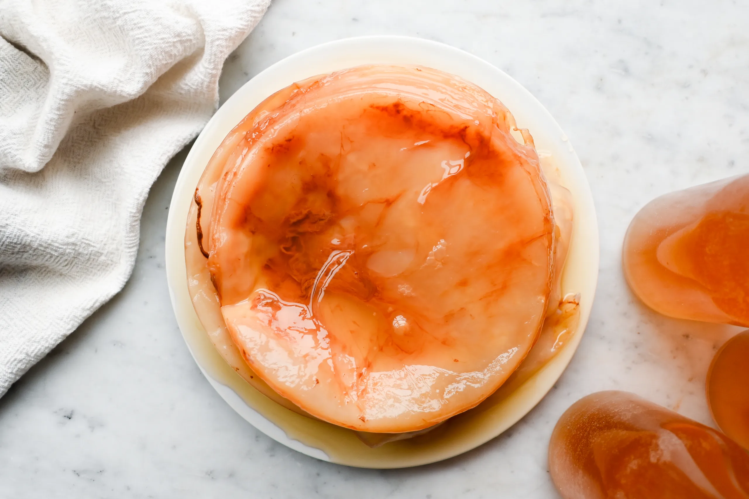 Kombucha tea starts with sweetened tea, a kombucha scoby, and starter tea. Over the course of the first fermentation, the scoby transforms the sweet tea into a lightly sour, refreshing drink. From there, I can either enjoy it as-is or move on to a second fermentation in bottles with fruit juice or fruit for even more flavor and fizz.