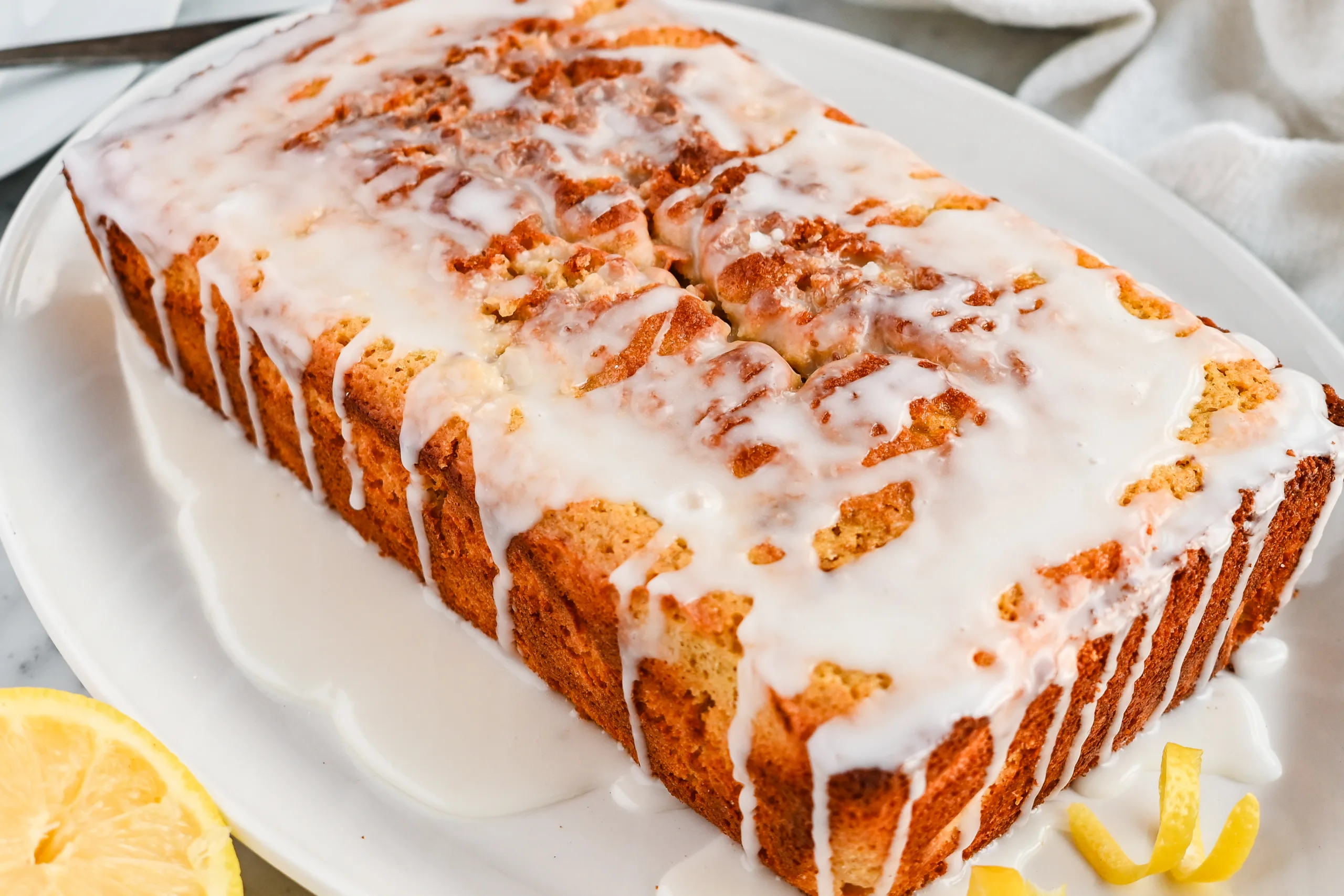 - Once the bread has fully cooled, drizzle the lemon glaze over the top and allow it to set before slicing.