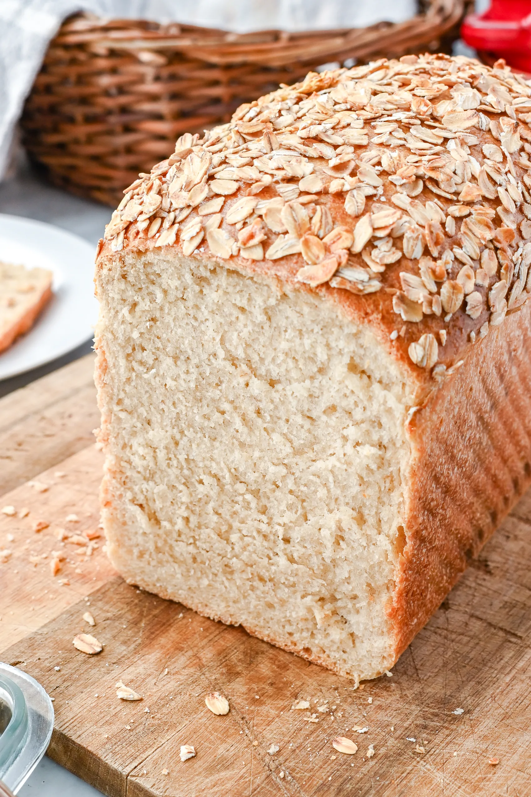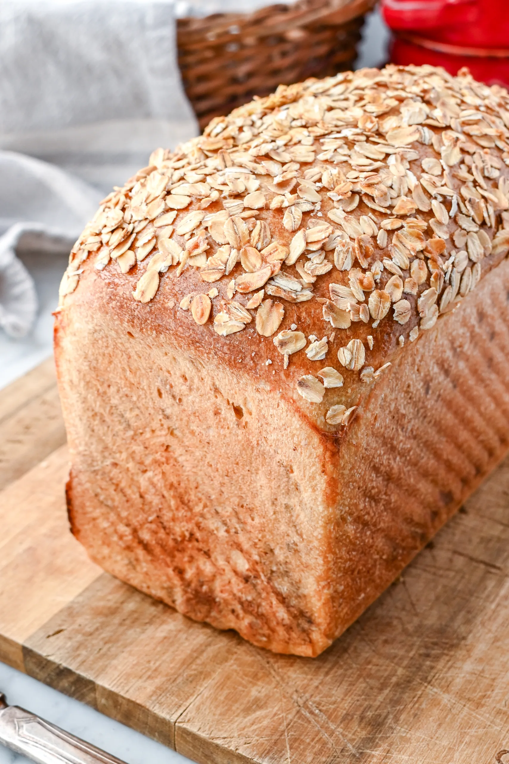 The oats hydrate during bulk fermentation, making the loaf tender without feeling heavy. It is not a whole wheat bread, but with the added butter and egg it still feels hearty and nourishing.