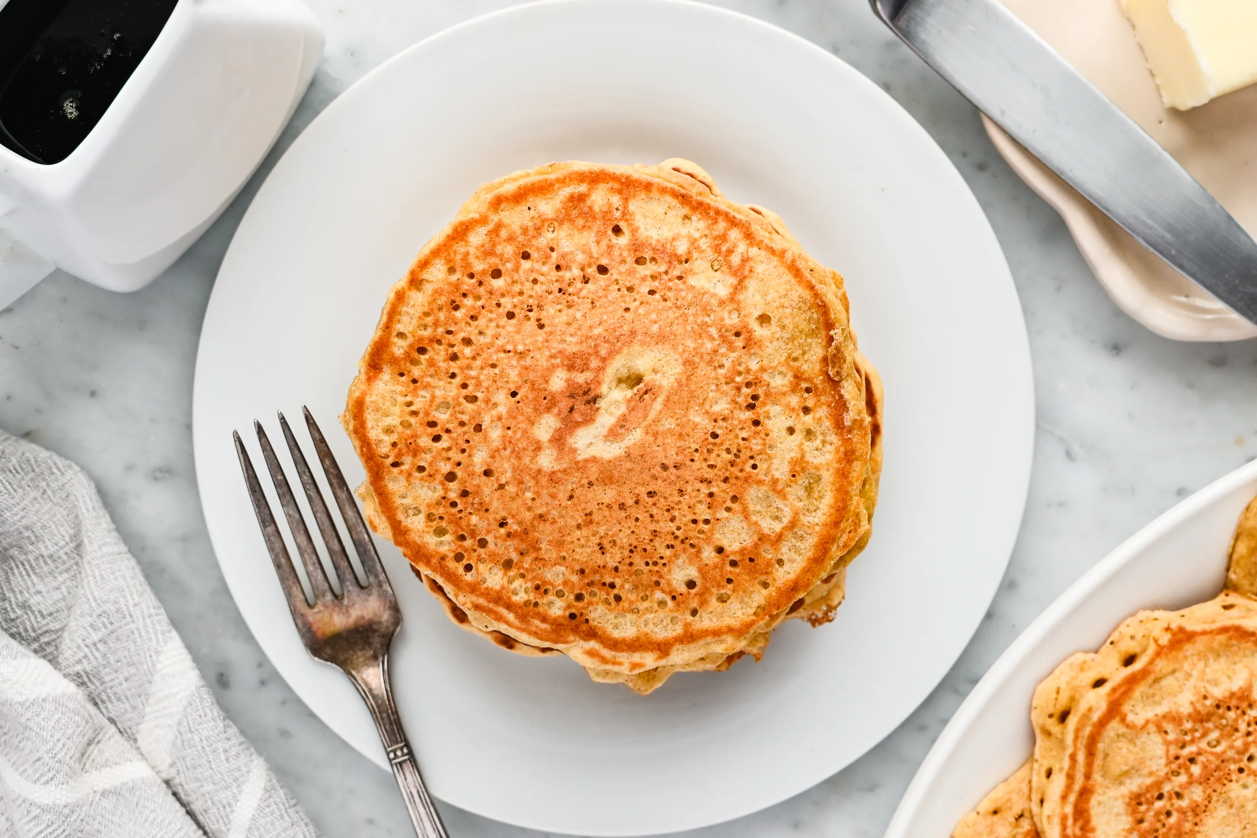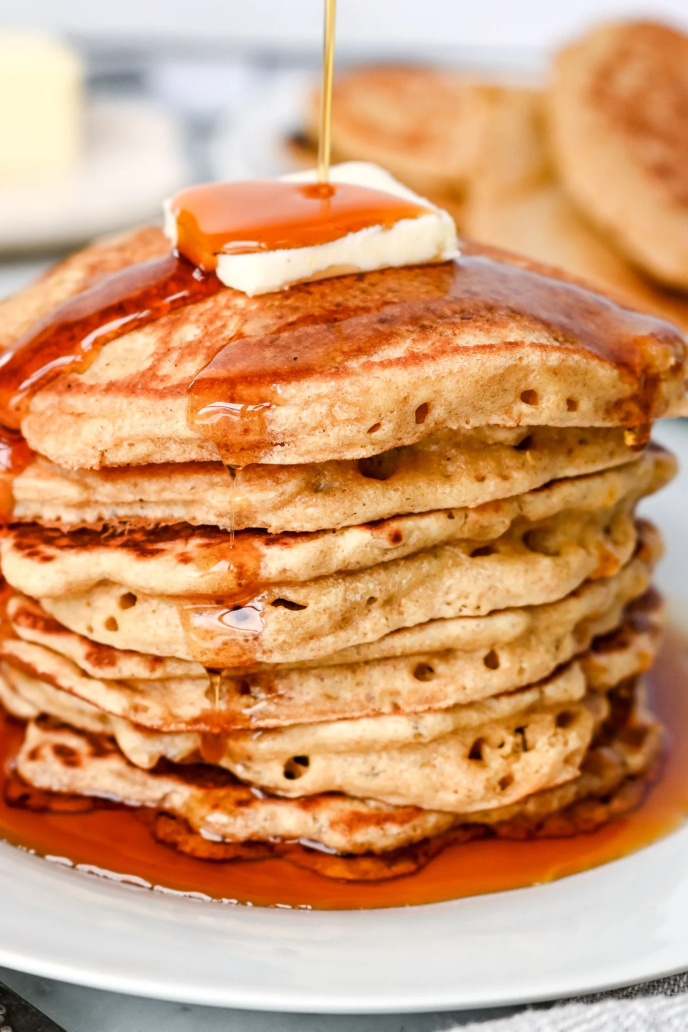 Adding sourdough discard gives these whole wheat pancakes a deeper flavor and a softer texture without making them taste sour. To use this option, stir ½ cup sourdough starter discard (or active starter) into the batter and reduce the milk by ½ cup to keep the consistency the same. Prepare and cook the pancakes as directed. This is an easy way to reduce waste while adding gentle fermentation benefits to a simple, old-fashioned breakfast.